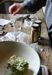 I asked Michelle to prepare the spices, so she measured out 1 teaspoon of cinnamon, allspice and fresh nutmeg and shredded 1 ounce of fresh ginger. The hops were added at 60, 15, and 5 minutes, and the spices were added at 10 minutes, then the contents were chilled and a London style yeast was pitched. The gravity was read at 1.049, and the preliminary taste was excellent. Maybe a little hoppy up front, but an excellent mixture of spices and a nice sweet pale body with a lovely fall desert finish. Now we wait.