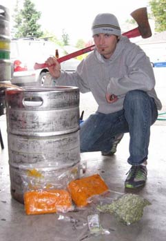 The pumpkin ale (recipe forthcoming) took much longer to mash & lauter than we expected, and we didn’t finish the boil until after 6 p.m. I suppose this is ok since it was a double batch, though we only pulled off like 8 gallons instead of the expected 10. Both the hot break and the krausen have a sickly lovely orange cruft on top showing that it was indeed a pumpkin ale. I baked the pumpkin down here in Portland and froze it in bricks, so they looked somewhat like illicit materials, along with the hops. We couldn’t resist doing a “drug bust” picture, but without guns, the only thing we could find was an axe. Not quite the effect we were going for, but funny in its own right.