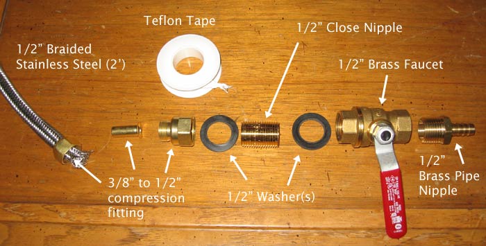 Assembling the mash tun was really quite simple (and quick) once I had all the correct parts. I had to make a second trip, this time to A-boy, to get a smaller close nipple and braided line. The images will link to larger versions when clicked. Well, without further ado.