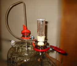 A gas lock and stopper go in the mouth of the carboy to keep bad air out and let carbon dioxide out. The lock is filled with sterile water so only air may pass out.