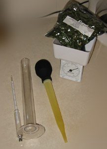 These are some common measuring devises used by home brewers. A Hydrometer, a cylindrical measuring vessel, a turkey baster, and a scale.