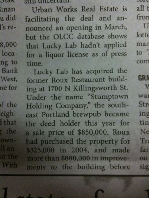 I was reading through the last print copy of The Sentinel, a North Portland paper, while waiting to see if I was goin to be placed on a jury this morning. I was trying to listen for my name when the words “Lucky Lab” caught my attention. Looks like the Lucky Lab bought the building that previosly housed Roux on Killingsworth. No details on plans or dates, but how exciting to get another walkable brewpub up here.